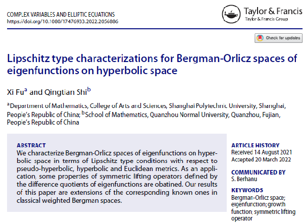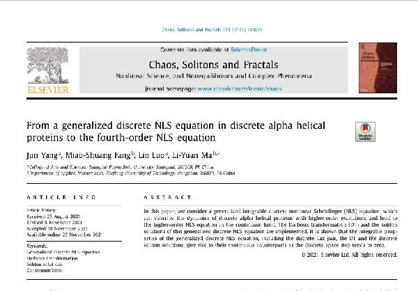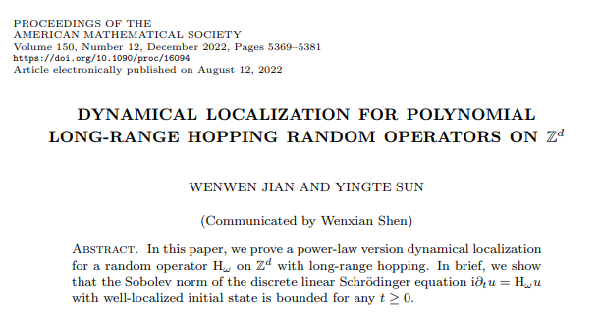 重视应用基础研究,写好创新赋能真文章。近年来,公司青年学术骨干纷纷聚焦国家、上海市重大战略需求与国内、国际学术前沿,将应用基础研究与实践探索相结合,依托学科平台与学术团队,推动理论创新和技术攻关,取得了一系列原创性研究成果。 1.太阳集团tyc33455官网杨军博士与其合作者撰写的论文“From a generalizeddiscrete NLS equation in discrete alpha helical proteins to the fourth-orderNLS equation”发表在国际期刊Chaos, Solitons & Fractals上。 【成果简介】 研究聚焦于一个广义离散非线性Schrödinger方程的连续极限理论,可以用来描述离散α螺旋蛋白链的高阶激发和相互作用。论文构造了广义离散Schrödinger方程的Darboux变换和多孤子解。对于单孤子解的动力学分析发现,孤子速度随着非线性项因子的增加而增加,整体呈线性关系;对于二孤子相互作用研究发现,孤子碰撞前后振幅和相位都没有发生变化,是标准的完全弹性碰撞。论文最后证明了在连续极限意义下,广义离散非线性薛定谔方程的可积性质,如Lax对、Darboux变换和多孤子解收敛到连续方程对应的Lax对、Darboux变换和多孤子解。这有助于理解离散的和连续的α螺旋蛋白链模型在非线性激化中的相关动力学行为。 【作者简介】 杨军,太阳集团tyc33455官网讲师,博士,主要研究方向为数学物理方程中的离散可积系统高阶怪波解、连续极限理论等。主持国家自然科学基金青年项目1项,近3年来,在《Commun Nonlinear Sci NumerSimulat》、《Nonlinear Dynamics》、《Chaos, Solitons &Fractals》等国内外重要SCI期刊发表学术论文4篇。 【成果简介】 团队在研究双曲几何中的Laplacian-Beltrami算子时发现,对于该类算子的特征函数能形成比普通Lp空间更为广泛的Bergman-Orlicz型空间.通过研究复杂的Orlicz型空间的结构,并借助于调和分析领域的空间插值理论,证实该空间也遗传了经典的Hardy –Littlewood特征。在此基础上,团队发现可以利用该结果来讨论双曲调和函数Bloch型空间的Lipschitz特征和提升算子的有界性。本文的研究方法和结果,为进一步研究双曲空间上的调和函数空间,椭圆方程、谱理论等提供了新的思路。 【作者简介】 符曦,太阳集团tyc33455官网副教授,博士,美国数学会 Math Review 评论员,主要研究方向为双曲几何与偏微分方程。先后主持国家自科基金和省部级项目3项,在国内外数学期刊上发表SCI论文20余篇。 3.太阳集团tyc33455官网菅雯雯博士与其合作者撰写的论文“Dynamical localization forpolynomial long-range hopping random operators on Z^d”发表在国际期刊Proceedings of theAmerican Mathematical Society上。 【成果简介】 自Anderson在随机算子谱理论领域的开创性工作,随即算子的局域化研究吸引了物理学界和数学界的广泛关注。在数学中,局域化对应着算子的纯点谱性质,动力学局域化是指算子所对应薛定谔方程解的Sobolev范数一致有界。本文主要研究具有多项式长程跳跃的高维随机算子。当随机位势具有Holder连续分布时,我们利用多尺度分析方法证明了该类算子的动力学局域化性质。该结果是多尺度分析方法的一个重要应用,为进一步研究慢衰减低正则性随机算子的局域化奠定了基础。