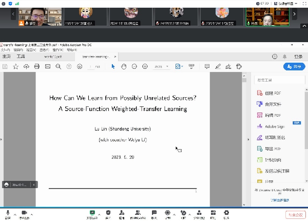 2023年6月20日下午13:00点,山东大学林路教授应邀作在线报告,报告题目是“How Can We Learn from Possibly Unrelated Sources? A Source-Function Weighted-Transfer Learning”。报告由姜荣教授主持。 林路是山东大学中泰证券金融研究院教授、博士生导师,第一和第二届教育部应用统计专业硕士教育指导委员会成员,山东省教育厅应用统计专业硕土教育指导委员会成员,山东省政府参事。从事大数据、高维统计、非参数和半参数统计以及金融统计等方面的研究,在国际统计学、机器学习和相关应用学科顶级期刊 (AOS, JMLR,《中国科学》等)和其它重要期发表论文120余篇,主持过多项国家自然科学基金课题、全国统计重大研发课题、教育部博士点专项基金课题、教育部新文科课题和山东省自然科学基金重点项目等,获全国统计优秀研究成果一等和二等奖、山东省优秀教学成果一等奖。 此次报告,林路教授详细介绍了机器学习中的移学习,分享了他在这方法取得的最新研究成果。最后的提问环节,跟太阳集团tyc33455官网的师生进行了交流和讨论。本次讲座拓展了本校师生对迁移学习的认识。
