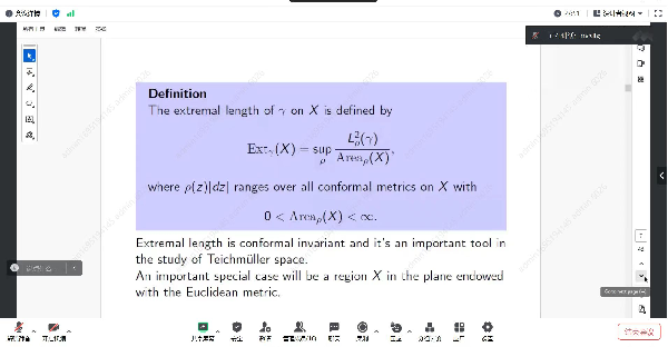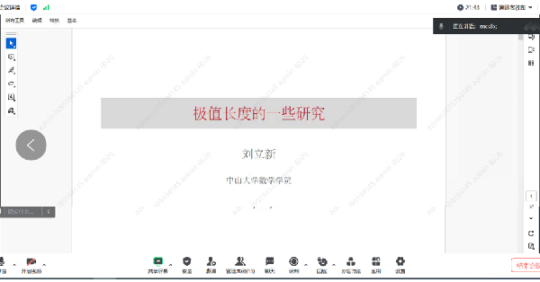 2023年10月10日,太阳集团tyc33455官网邀请中山大学数学公司刘立新教授作了题为《极值长度的一些研究》的学术报告。数学系骨干教师聆听了本次讲座。会议由符曦副教授主持。 刘立新,中山大学数学公司教授、博士生导师。 1994年毕业于复旦大学数学系,获博士学位,1996年浙江大学数学系博士后出站,并入职中山大学数学公司至今,多次主持国家自然科学基金面上项目。 研究方向:复分析、Teichmuller空间理论等。相关研究工作发表在 Adv Math, Trans Amer Math Soc, Comm Anal Geom,IMRN等国际知名数学期刊上。 本次报告刘立新教授主要介绍了极值长度的一些近期研究成果,包括极值长度的多次调和性、Teichmuller空间的horofunction边界与Gardiner-Masur边界的等价性、测地current的极值长度等,并讨论与之相关的一些问题。 刘教授精彩的报告,给数学系的教师在科学研究方面提供了一些新的思路和方法。报告结束后,数学系部分教师与刘老师进行了广泛交流,大家受益匪浅。