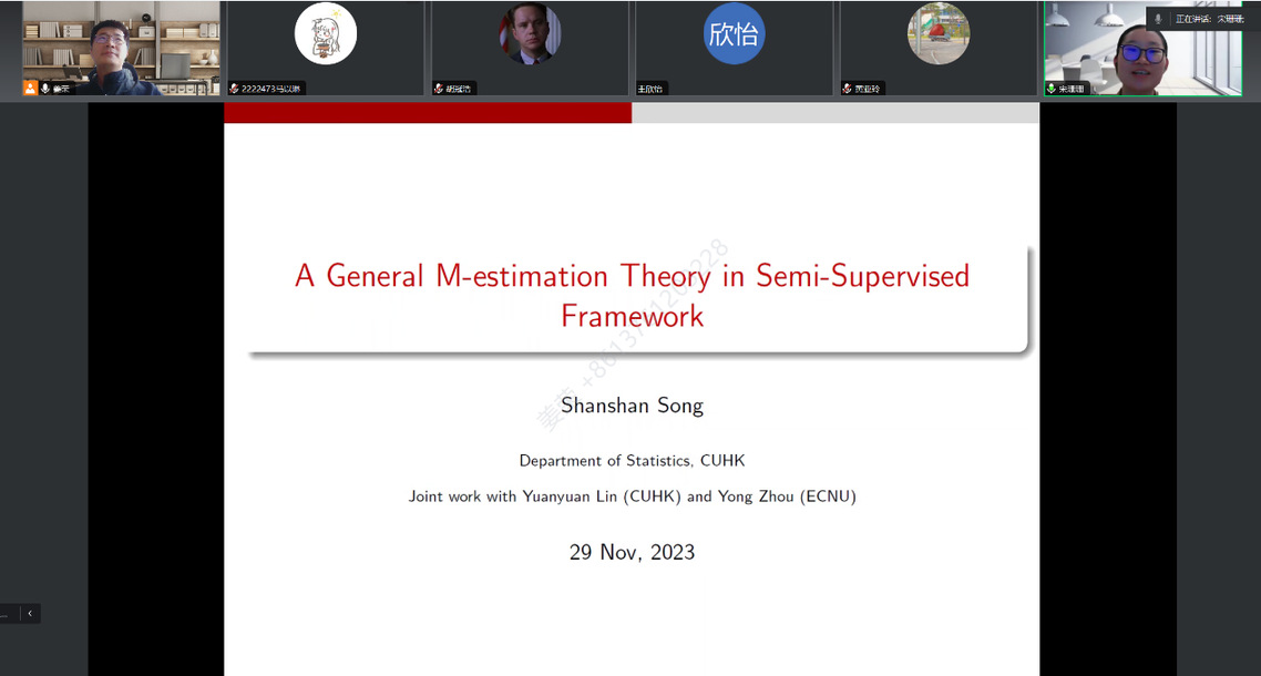 2023年11月29日09:00-10:30,香港中文大学宋珊珊博士应邀作学术报告,报告题目是“A General M-estimation Theory in Semi-Supervised Framework”。报告由姜荣教授主持。 宋珊珊博士,目前在香港中文大学统计系做博士后研究员。在此之前,她在2020年于上海财经大学取得博士学位。宋博士的研究方向包括大数据分析,半监督学习,统计机器学习。相应成果已发表在JASA,CJS,Fundamental Research等期刊。 此次报告,宋珊珊博士介绍了统计学中的一个学术前沿问题:半监督学习。宋珊珊博士报告了她发表在统计顶级期刊上关于半监督学习的科研成果,并介绍了半监督学习问题中的一些前沿研究方向和工作。最后的提问环节,跟太阳集团tyc33455官网的师生进行了交流和讨论。本次讲座拓展了本校师生对半监督学习问题的认识。
