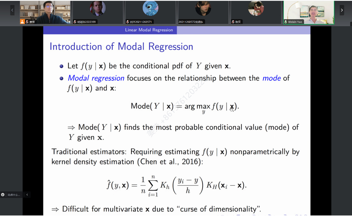 2023年11月28日12:30-14:00,美国加州大学河滨分校姚卫鑫教授应邀作学术报告,报告题目是“New Regression Model: Modal Regression”。报告由姜荣教授主持。 Weixin Yao教授、博士生导师,加州大学河滨分校统计系副主任。主要研究混合模型、非参数和半参数建模、稳健数据分析和高维建模等。曾担任《Biometrics》、《Journal of Computational and Graphical Statistics》、《Journal of Multivariate Analysis》和《The American Statistician》等多家著名期刊的副主编及《Advances in Data Analysis and Classification》期刊客座主编。在Journal of the American Statistics Association, Journal of the Royal Statistical Society, Ser B, Journal of Economics等SCI期刊发表论文90余篇。 此次报告,Weixin Yao教授介绍了一种新的回归模型:众数回归。姚教授从众数回归应用和优点开始介绍,接着报告了他在众数回归研究中取得的成果,最后介绍了一些前沿研究方向和工作。在提问环节中,跟太阳集团tyc33455官网的师生进行了交流和讨论。本次讲座拓展了本校师生对众数回归问题的认识。