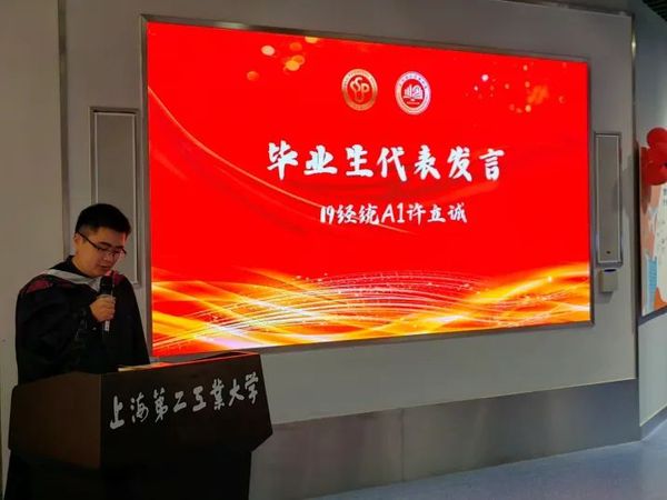 人生的序章,始于初秋,跨越山海,终于盛夏。青春的注脚在这一刻绽放,窗前拂过的微风,繁花以礼相送,蝉鸣与六月专属的栀子花香织出了这场盛大的告别。2023届毕业生以“扬帆新征途 远航向未来”为主题的毕业典礼于6月18号上午七点,在包起帆创新之路展馆四楼举行,这也是离校前的最后一次劳动教育,我们从劳模精神的教育中走出来,即将成为社会中的一名劳动者。 毕业的学长学姐们伴着温馨的暖场视频陆续进场,公司党总支副书记丘璐老师致开幕词后,典礼正式开始。 首先,由统计系专业教师代表张宣昊老师向毕业生表示祝贺的同时,表达了对所有毕业生的希冀——祝愿你们走好人生的每一段旅途,保持乐观,无畏失败,勇于探险,超越自我,既要脚踏实地,也要仰望星空。道阻且长,行则将至,行而不辍,未来可期。前方的路会有曲折,但也充满希望。时光不负奋斗者,岁月眷顾追梦人。努力成长的你们终将成为祖国的栋梁。 最后,张宣昊老师希望学子们在学习和工作之余,注重个人成长和平衡生活。保持身心健康,培养良好的生活习惯和兴趣爱好,与家人、朋友和同事建立深厚的关系。“人生的意义不仅在于追求事业成功,更在于建立有意义的人生和人际关系。”张宣昊老师如是说。 会议第二项,由毕业生代表许立诚同学发言,回首大学四年,犹忆初入校园时的青涩模样,四年时光荏苒,金海路2360号的图书馆、篮球场、体育馆等等都留下了他们青春挥洒的足迹。如今的他们,具备了更加丰富的技能,拥有了面对是非曲直的能力,获得了更加广阔的事业,得到了全面的发展,宛如一朵奔涌的浪花,汇入新时代的海洋,19经统专业的学子们未来可期! “追风赶月莫停留,平芜尽处是春山。”这段旅途即将落幕,新的旅途即将开启,或许此次的别离,是为了更好的相遇,我们的故事与青春未完待续……
