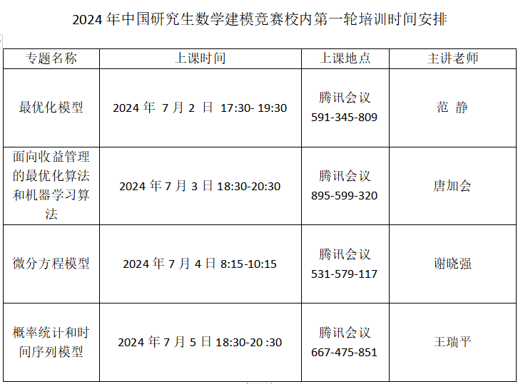 一、竞赛简介 全国研究生数学建模竞赛是“全国研究生创新实践系列活动”的主题赛事之一,由教育部学位与研究生教育发展中心主办。该赛事起源于2003年东南大学发起并成功主办的“南京及周边地区高校研究生数学建模竞赛”;2013年被纳入教育部学位中心“全国研究生创新实践系列活动”。其宗旨是为广大研究生探究实际问题、开展学术交流、培养团队意识搭建有效平台,培养研究生创新意识,提升研究生创新实践能力,进一步推动公司产品机制改革和“研究生教育创新计划”的实施,促进公司产品质量的提高。 在公司数学建模指导组的培训和指导下,公司研究生曾多次获得全国一、二、三等奖等奖项。竞赛组委会秘书处常设东南大学,2024年第二十一届中国研究生数学建模竞赛由山东大学承办。本届竞赛赞助单位为华为技术有限公司。竞赛时间为:2024年9月21日8:00至2024年9月25日12:00。望各年级、各专业研究生同学积极参加此次竞赛。 二、报名事宜 1、研究生组队参赛(每队3人)。参赛对象为公司在读研究生和将于2024年秋季学期入学的研究生,专业不限。除2024级研究生外,其他年级研究生不允许跨校、跨单位组队参赛。 2、本届参赛研究生请登录“研创网”注册账号,并由队长报名参赛。参赛团队报名截止时间为:2024年9月17日(周二)17:00。 3、报名参赛队需要关注审核结果。审核通过后,由公司统一缴纳参赛报名费(每队300元)。请参赛队务必在竞赛期间遵守竞赛纪律,并提交竞赛论文。 4、具体信息可查看: https://cpipc.acge.org.cn//cw/detail/4/2c9080188fc20569018fc423bcd204ab。 太阳集团tyc33455官网 2024年6月28日 附:2024年中国研究生数学建模竞赛校内第一轮培训时间安排 2024年研究生数学建模竞赛微信群