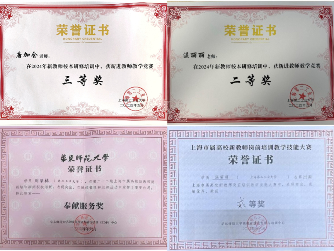 2024年6月28日,上海市属高校新进教师岗前培训教学技能大赛暨结业典礼线上线下同步举行,上海市教委人事处、上海商公司人事处、华东师范大学高级管理者发展与培训中心相关领导以及340多名青年教师参加本次结业典礼。本期培训历时两个半月,主要设有“专题讲座”、“校本研修”、“拓展训练”、“说课训练”、“模拟教学”、“教学技能大赛”等多项学习环节,公司3名青年教师参加本次培训并顺利完成学习任务。 5月17日,校本研修环节,公司温丽丽老师获得教学竞赛二等奖、唐加会老师获得教学竞赛三等奖。6月28日,上海市属高校新进教师岗前培训教学技能大赛暨结业典礼教学技能大赛环节,公司温丽丽老师获得二等奖,周梁栋老师荣获活动贡献奖。 获奖名单及证书如下: 姓名 获奖名称 1 唐加会 上海市属高校新教师岗前培训“校本研修”教学竞赛三等奖 2 周梁栋 上海市属高校新教师岗前培训活动贡献奖 3 温丽丽 上海市属高校新教师岗前培训教学技能大赛二等奖 上海市属高校新教师岗前培训“校本研修”教学竞赛二等奖 自新教师入职以来,公司高度重视新教师的成长和发展,帮助新教师增进职业理解,尽快融入公司教学科研工作。公司将继续关注和支持青年教师的成长,引导青年教师进一步成为有理想信念、有道德情操、有扎实学识、有仁爱之心的“四有”好老师。