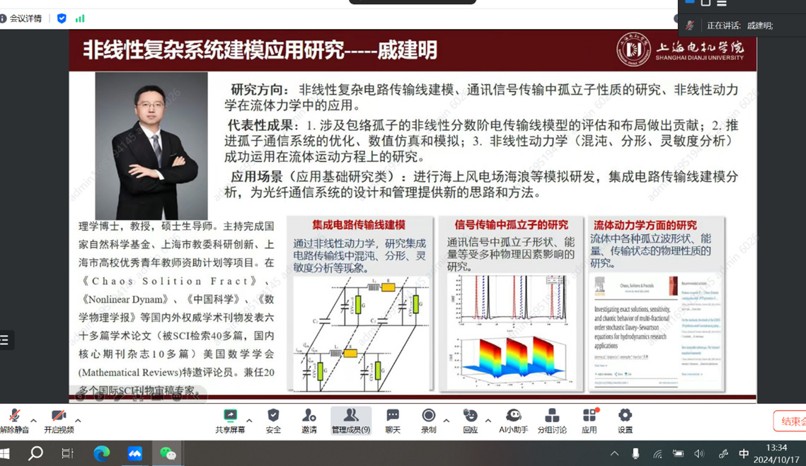 10月17日下午,上海电机公司戚建明教授应邀为公司师生作题为:基于分数阶非线性低通传输线路的动力学行为研究的学术报告。此次报告由符曦老师主持。 报告人简介:戚建明,上海电机公司教授,硕士生导师,东芬兰大学数学物理公司高级访问学者。主要从事复分析、集成电路中分数阶非线性复杂电路传输线建模、通讯信号传输中的孤立子物理性质等领域的研究。主持完成国家自然科学基金、上海市教委科研创新、上海市高校优秀青年教团队助计划等项目。在《Chaos Solition Fract》、《Nonlinear Dynam》、《Alex Eng J》、《中国科学》、《数学物理学报》等国内外权威学术刊物发表六十多篇学术论文(被SCI检索40多篇,国内核心期刊杂志10多篇)。 本次报告,戚老师介绍了低通传输线路的研究目的和意义。传统的传输线路动力学模型通常是基于整数阶微分方程建立的,引入分数阶微积分则可以更精确地描述非线性系统的动态行为,更为精确的描述整个电力系统能量流动行为,更能反应电路系统中谐振频率的频率特性和传输特性。在报告中,戚老师报告了基于分数阶非线性低通传输线路的数学模型、分数变阶对低通传输的影响以及自由参数的选择、分岔行为等。 通过戚教授的报告,使我们进一步认识分数阶微分方程在非线性复杂系统、通讯信号的数学建模中的重要应用。报告结束后部分师生与戚老师还进行了深入交流和讨论。