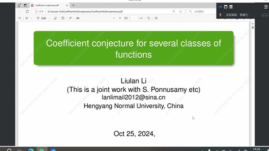 10月25日下午,衡阳师范公司李浏兰教授应邀为公司师生作题为:Coefficient estimates for some classes of functions的学术报告。此次报告由符曦老师主持。 报告人简介:李浏兰 博士,衡阳师范公司教授,硕士生导师,湖南省数学会理事。主要从事Klein群和调和映射等几何函数理论的研究。在《Proc. Amer. Math. Soc.》《J. Math. Anal. Appl.》《Nonlinear Anal.》《Isr. J. Math.》当国际国内重要刊物上发表科研论文30余篇。先后主持完成国家自然科学基金、湖南省杰出青年基金、省自然科学青年基金、省教育厅优秀青年基金和省教育厅重点项目等项目。2020年,科研成果“与调和映射理论相关的若干问题的研究”获得省自然科学奖三等奖(排名第二)。 本次报告,李教授首先介绍了经典单叶解析函数中的两个著名系数猜想:Bieberbach 猜想和Zalcman 猜想。基于这两个猜想,关于单叶解析函数系数的研究,已有一系列的研究成果。接着,李老师报告了单位圆盘上一类特殊单叶函数的系数估计结果,与传统的研究方法不同,她们巧妙地借助于一类连续凸泛函的性质,获得函数的具体表达形式,从而得到精确的系数估计。最后,李老师还介绍了系数估计研究中一些没有解决的问题。 通过李教授的报告,使我们深刻理解了单叶解析函数中系数估计的重要性。报告结束后部分师生与李老师还进行了深入交流和讨论。