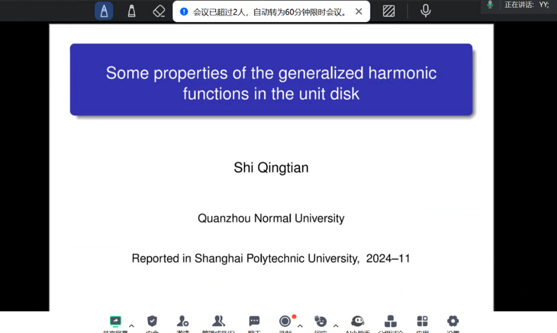 11月14日上午,泉州师范公司石擎天副教授应邀为公司师生作题为:Some properties on the generalized harmonic functions in the unit disk的学术报告。此次报告由符曦老师主持。 报告人简介:石擎天,北京航空航天大学博士,现为泉州师范公司数学与计算机科学公司院副教授,泉州市高层次人才。研究方向为复分析(调和映射及函数空间),主要研究平面上调和映射的Schwarz引理、 Lipschitz连续性、边界Schwarz引理、拟共形延拓等性质,以及调和映射在函数空间上的性质,相关的研究成果发表在 Complex Var. Elliptic, CMFT,Filomat, AIMS Math.,Acta Math Sci., 数学年刊等期刊上。主持福建省科技厅项目1项、福建省教育科研项目1项、省级本科教学改革项目1项。 本次报告,石老师首先介绍了一类(a,b)型的二阶椭圆算子,利用该算子定义出复平面内广义的调和函数。接着,石老师报告了近期关于单位圆盘内广义调和函数三个主要研究结果:Lipschitz连续性、Schwarz-pick引理和偏导数的正则性,并详细讲解了对于此类问题的具体研究方法和工具。 通过石老师的报告,使我们深刻理解了单位圆盘上调和函数理论的重要性。报告结束后部分师生与石老师还进行了深入交流和讨论。