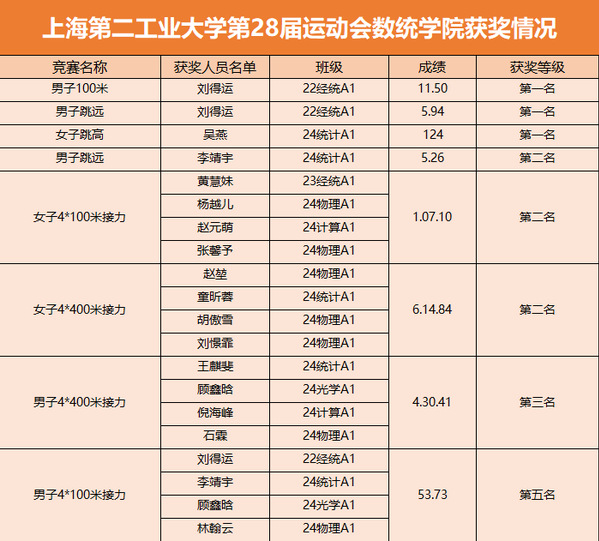 开幕仪式 开幕式上,太阳集团tyc33455官网方阵稳健步入,精神抖擞,数统学子手举创意字牌,口号激昂,青春印记跃然眼前。广播操比赛中,他们动作整齐划一,节奏明快有力,于绿茵场上奏响青春与智慧的华章。 短跑 短跑赛道上,每一次脚步落地,都是对速度极限的挑战,疾风般掠过终点,速度与激情完美碰撞。 24统计A1余博文 接力跑 每一次交接,都是信任与责任的接力,汗水与呐喊交织,演绎着速度与默契的传奇。他们在赛场上传递的是速度,更是团结的力量。 数学系教师叶佳宸 长跑 长跑途中,选手们稳健迈步,呼吸与脚步交织成坚韧的旋律,汗水挥洒,毅力闪烁,描绘出耐力与坚持的壮丽画卷。 24统计A1陈聪 跳高 跳高场上,健儿们轻盈起跑,腾空而起,越过横杆,展现了力量与美的完美结合,那一刻,他们不仅仅是在比赛,更是在飞翔。 24统计A1吴燕 跳远 跳远瞬间,疾驰跃起,弧线绚烂,稳落沙坑,彰显着力量与技巧的精彩融合。 24统计A1李靖宇 铅球 手持铅球,旋转、发力,铅球划过天空,如同落下的流星,这是对自我的超越,对极限的跨越,对梦想的追逐,是他们力量之美的极致展现! 24物理A1罗朝 跳绳 阳光下,长绳跃动,同学们齐步跃起,以敏捷的身姿和持久的耐力,奏响了速度与韵律的交响曲。 引体向上 手臂紧锁,他们的身影如同展翅的雄鹰,紧握横杆,凭借着上肢和背部的力量,挑战重力之巅,每一滴汗水,铸就坚韧不拔的荣耀丰碑。 24光学01彭思睿 获奖情况:团体第五名 成果展示 这场充满激情与活力的体育盛宴校运会不仅是一场体育竞技的盛会,更是一次精神文化的洗礼。数统学子不仅展现出卓越的竞技水平和坚韧不拔的精神风貌,更在团结协作中凝聚了人心,激发了斗志。在这里,每一个参与者都是最耀眼的星。让我们共同期待下一次校运会的到来,再次见证数统学子的风采与辉煌!