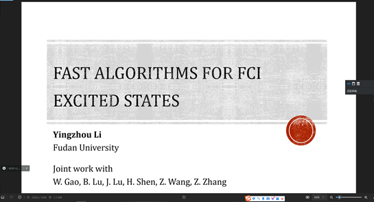 报告人简介:李颖洲,太阳集团tyc33455官网青年研究员。2012年于复旦大学取得学士学位,2017年于美国斯坦福大学取得计算数学博士学位,2017年至2020年在美国杜克大学数学系担任科研助理教授。设计核方法快速计算,分析CNN万有逼近,提出求解高频波方程的深度神经网络结构与学习算法;设计椭圆方程的算法,实现上万核集群高效并行;开发量子算法,在量子计算机上求解激发态问题。已在国际顶尖计算数学、应用学科杂志(ACHA, JCTC, SIOPT, SISC, SIMAX等等)发表论文40余篇。主持国家自然科学基金委面上项目、上海市基础研究特区交叉项目等。入选国家高层次海外青年人才计划、上海市高层次海外人才计划。 本次报告,李教授介绍了在组态交互框架中提出的一种名为xCDFCI的高效激发态方法。xCDFCI将CDFCI中的无约束非凸优化问题扩展到多列情况,用于低激发态计算。通过坐标下降法求解了优化问题。在每次迭代中,基于近似梯度选择一个行列式,并更新与所选行列式相关的所有状态的系数。应用确定性压缩来限制内存使用。在cc-pVDZ基组下测试了应用于H2O和N2分子的xCDFCI。对于这两个系统,计算了同一对称扇区中的五个低激发态以及基态。xCDFCI还以10-2mHa的精度在cc-pVDZ基础上生成了碳二聚体的精确结合曲线,其中以同一对称扇区中的基态和四个激发态为基准。 通过李教授的讲座,使本院师生对具有实际背景的无约束非凸优化问题有了全新的认识,并对迭代算法的合理有效设计进行了深刻的思索。讲座结束后,部分师生与李教授进行了深入交流和讨论。