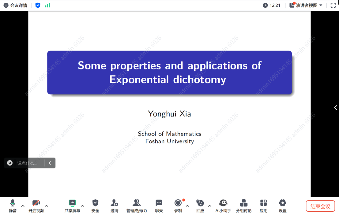 11月26日晚上,佛山大学夏永辉教授应邀为公司师生作题为:浅谈指数二分性的性质及其应用的学术报告。此次报告由高美娜老师主持。 报告人夏永辉,现为佛山大学教授,学科方向带头人。曾获省部级科技进步奖3项,其中浙江省科学技术进步一等奖1项(前三完成人), 获福建青年科技奖。入选闽江学者特聘教授;2012年入选浙江省“151人才工程”第二层次。2021年,2023年科技部重点研发计划答辩会评专家组成员。多次担任科技部、教育部以及各省市人才项目和科技奖励、基金项目的会评专家或通讯评议。主持国家自然科学基金3项(其中面上2项),参与国家重点1项,主持浙江省基金重点项目1项。曾任浙江师范大学“杰出学者”特聘教授、博士生导师,与合作者一起推广了著名学者庞加莱和李雅普诺夫关于二维平面系统可积的充要条件的经典理论,将此可积理论推广到了任意有限维;建立了四元数体上微分方程理论与应用的基本框架(已经形成专著在中国科学出版社出版);改进了经典的全局Hartman-Grobman线性化定理。 本次报告中,夏永辉教授介绍了指数二分性的一些相关性质,尤其是相容性和二分谱,多项式二分谱与经典二分谱的关系,及其在约化的应用。另外,关注指数二分性在流形以及Hartman-Grobman拓扑全局线性化的相关应用。报告结束后部分老师与夏永辉教授进行了深入交流和讨论。