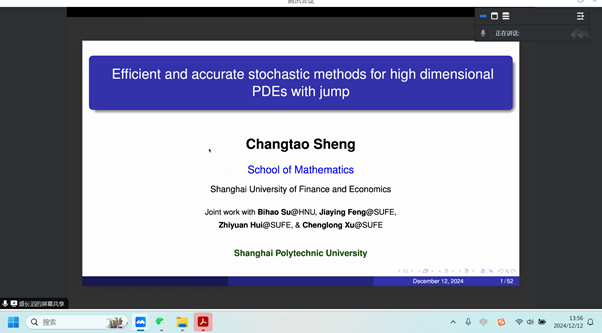 12月12日下午,上海财经大学数学公司盛长滔教授应邀为公司师生作题为“Efficient and accurate stochastic methods for high dimensional PDEs with jump”。此次学术报告由邵文婷老师主持。 报告人简介:盛长滔,上海财经大学数学公司教授,博士生导师,2018年于厦门大学获得理学博士学位,之后在新加坡南洋理工大学从事博士后研究。主要研究方向为谱与谱元法以其应用、非局部问题和奇性问题的高精度数值方法、高维偏微分方程的随机算法等。目前为止,在SIAM系列, Math. Comp.等知名国内外期刊上发表SCI论文20余篇。 本次讲座,盛长滔教授介绍了一种高效的蒙特卡洛模拟方法求解一类不规则区域上的高维偏微分方程。进一步,介绍了谱蒙特卡洛迭代方法,结合了多种计算技术,包括基于正交多项式的插值技术,空间时间谱配点法,控制变量法和新颖的walk-on-sphere方法。通过充分的数值实验结果验证了算法的高精度和理论分析结果。 通过盛长滔教授的报告,使本院师生对蒙特卡洛模拟和随机微分方程在实际问题上的应用有了形象生动的了解。报告结束后,本院师生与盛教授进行了深入交流和讨论,盛教授也期待与本院师生的学术合作。